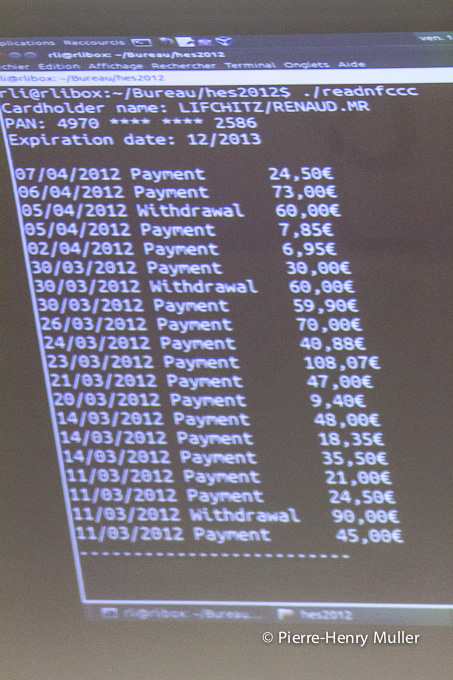 Une démonstration est faite avec sa carte bleue dans son porte feuille qu’il approche du lecteur. Instannnément toutes les données se trouvant dans sa carte sont apparues. On y voit son numéro de carte bleue, sa date d’expiration, son identité et l’historique de ses achats. Une deuxième démonstration est faite sur un système Android, les mêmes données apparaissent. On imagine aisément les conséquences de scan avec un téléphone dans un métro bondé.