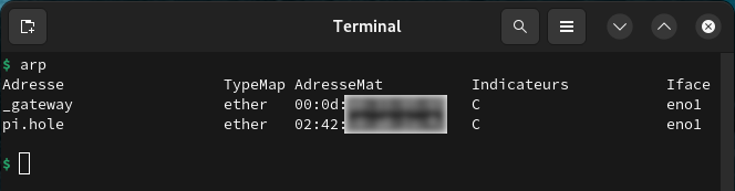 La commande va alors afficher la ou les correspondances entre les adresses IP et adresses MAC connues et sur quelle interface elles ont été trouvées. Cette commande va tenter également de résoudre les IPs des hôtes au niveau DNS par défaut.